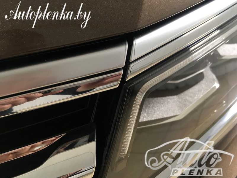 Антигравийная защита авто Volkswagen Tiguan 2018 года включает в себя капот и передние крылья цельно, оптику, стойки лобового стекла, зеркала, переднюю часть крыши, бампер, внутренние пороги, набор подручек и хром передней части автомобиля.
